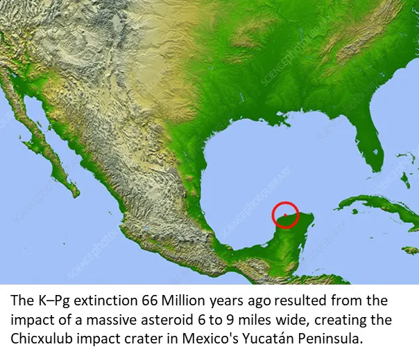 The Cretaceous–Paleogene (K–Pg) extinction event, formerly known as the Cretaceous-Tertiary (K–T) extinction event, was a major mass extinction of three-quarters of the plant and animal species on Earth, which occurred approximately 66 million years ago. The event caused the extinction of all non-avian dinosaurs and most other tetrapods weighing more than 25 kg (55 lb.), with the exception of some ectothermic species such as sea turtles and crocodilians. It marked the end of the Cretaceous period, and with it the Mesozoic era, while heralding the beginning of the current geological era, the Cenozoic Era. In the geologic record, the K–Pg event is marked by a thin layer of sediment called the K–Pg boundary or K–T boundary, which can be found throughout the world in marine and terrestrial rocks. The boundary clay shows unusually high levels of the metal iridium, which is more common in asteroids than in the Earth's crust.