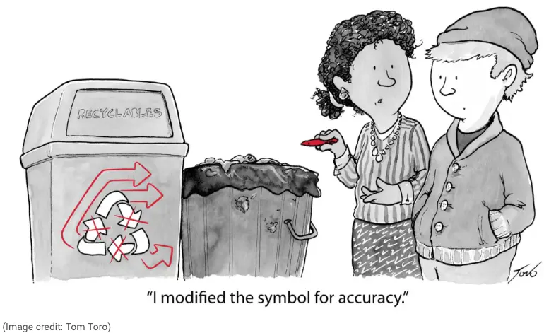 This is no laughing matter. I’m way short of time this morning, so let me just say I’m almost done reading at great book entitled Waste Wars: The Wild Afterlife of your Trash, published this yr. Author Alexander Clapp has done excellent sleuthing to amass a trove of information, + I have several pages of notes in the back to be transcribed into my computer. Much of recycling is a scam pushed by the petroleum industries to think the approximately 100,000 types [not 7] of plastic are actually recyclable. And that they are shoving responsibility onto consumers for the plastification of the planet. This cartoon—with its ‘chasing arrows emblem’—seems apropos considering what revelations I am discovering.