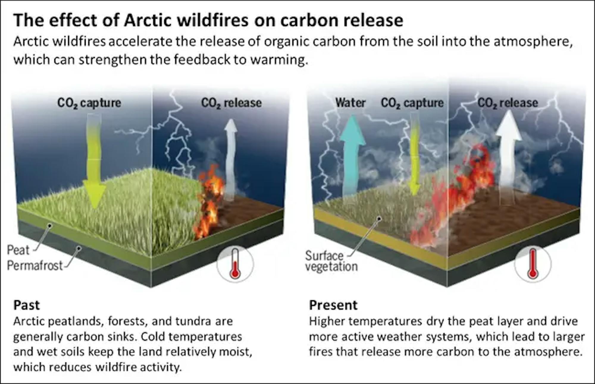 Vast amounts of organic carbon are stored in Arctic soils. Much of this is in the form of peat, a layer of decomposing plant matter. Arctic wildfires release this carbon to the atmosphere as carbon dioxide (CO2) and contribute to global warming. This creates a feedback loop in which accelerated Arctic warming dries peatland soils, which increases the likelihood of bigger, more frequent wildfires in the Arctic and releases more CO2, which further contributes to warming. Although this feedback mechanism is qualitatively understood, there remain uncertainties about its details.