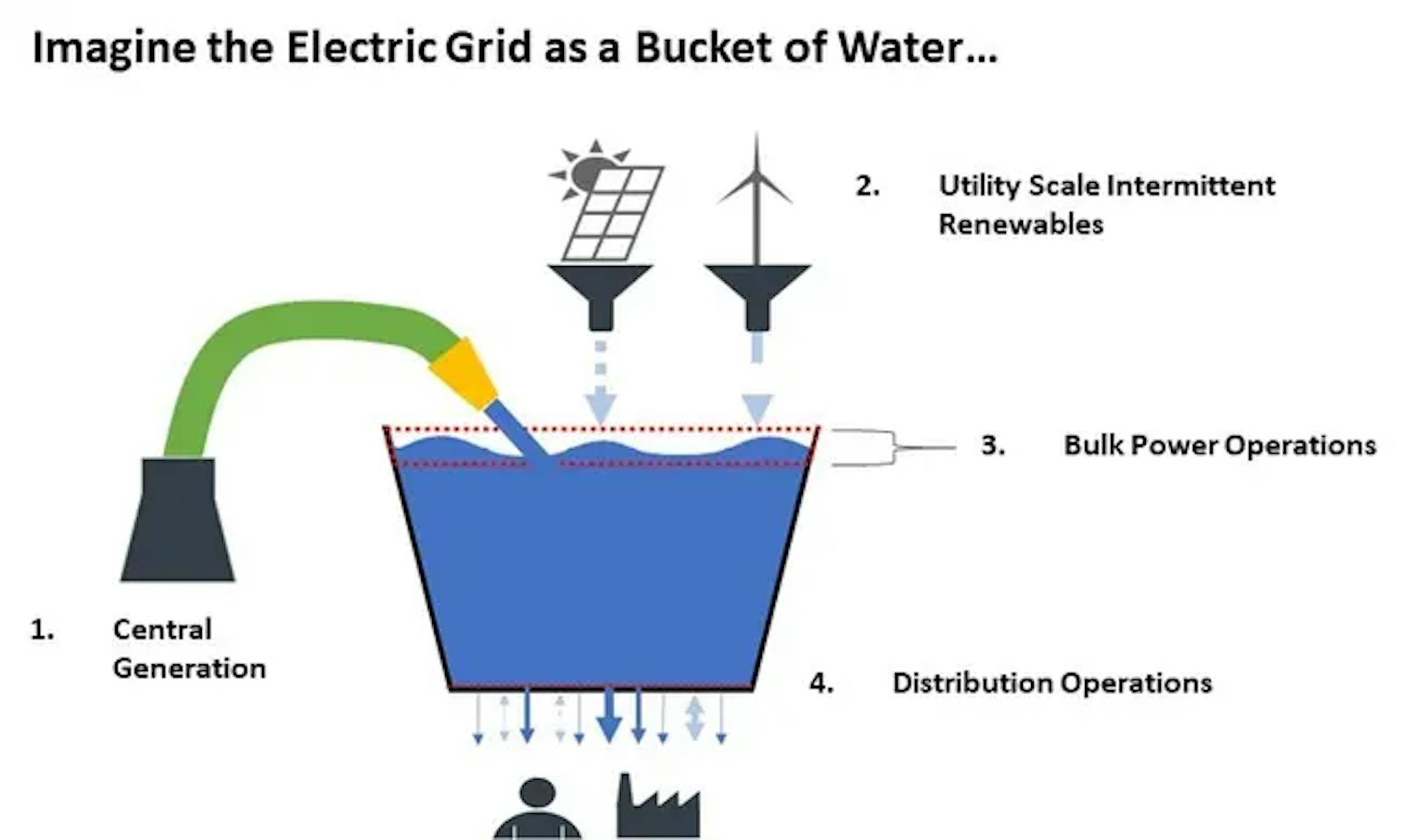 Imagine that the bucket, hoses, funnels, and (potentially) the ultimate retail customer relationship are all owned and operated by separate entities that are uniquely driven to optimize their own business. Water from each hose or funnel can potentially serve multiple buckets, and each hose or funnel supplies water at a different price point. In this world, there needs to be signals to coordinate the dispatch of each asset that serves the bucket. Without getting too deep into the weeds of RTO/ISO, LBA, and Transmission operations, these signals can be can be market (e.g. auction or exchange) or technical in nature; in their totality, these Bulk Power signals maintain the overall level of water, while juggling Regional, State, and corporate governance rules. - Distribution Operations. Frankly, the bucket analogy begins to fray at the Distribution level. However, for the sake of maintaining the visualization, imagine that the bucket is actually composed of thousands of smaller interconnected buckets (i.e. distribution feeders). Bulk Power Operations maintains the overall level of the larger bucket, while the holes that represent customer consumption are connected to one or more of these smaller buckets.