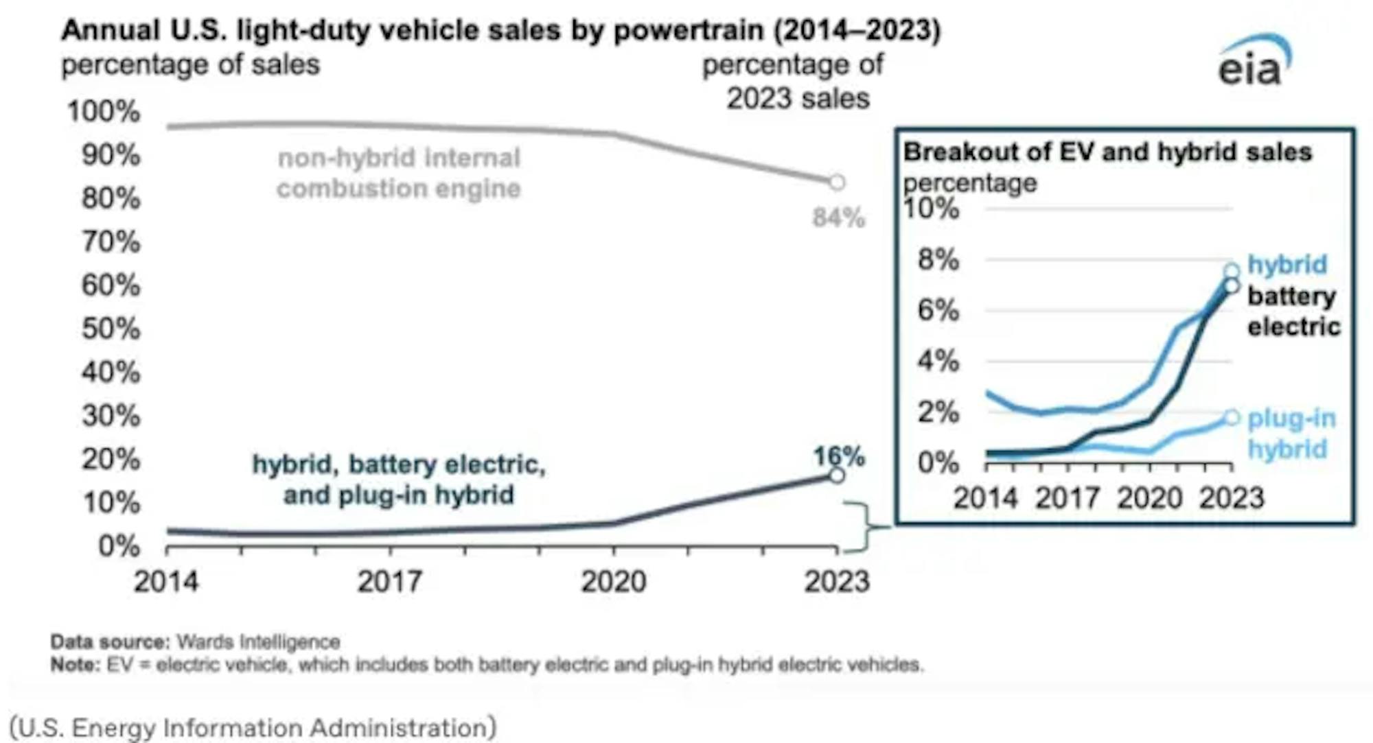Canary: "Chart: Gas-powered cars are losing market share to EVs and hybrids." In 2023, traditional fossil-fueled cars dropped to 84% of total passenger vehicles sales in the US—the lowest ever. Contrariwise, sales of both fully electric cars + hybrids are climbing to new heights. "The change is driven in part by a surge in sales for hybrid vehicles with a gas-powered engine and an onboard battery but no plug, which together with plug-in hybrids made up nearly 10 percent of new car sales last year, according to the U.S. Energy Information Administration." Sadly, hybrids may burn less gas than a conventiona car, but they fail to offer a pathway to eliminating carbon pollution from our highways + roads. "Last year, despite some market difficulties, [EVs] accounted for 7 percent of new vehicle sales. The transportation sector accounts for over a quarter of American greenhouse gas emissions. Walkable cities, bike lanes, mass transit + all the other solutions to our reliance on fossil fuel cars require support as well. Once pure electric vehicles reach 15% of new vehicle sales, energy experts predict a tipping point will have been reached. Time is short + the water is rising. Electric bikes may be the gateway drug, but truly EVs are the future.