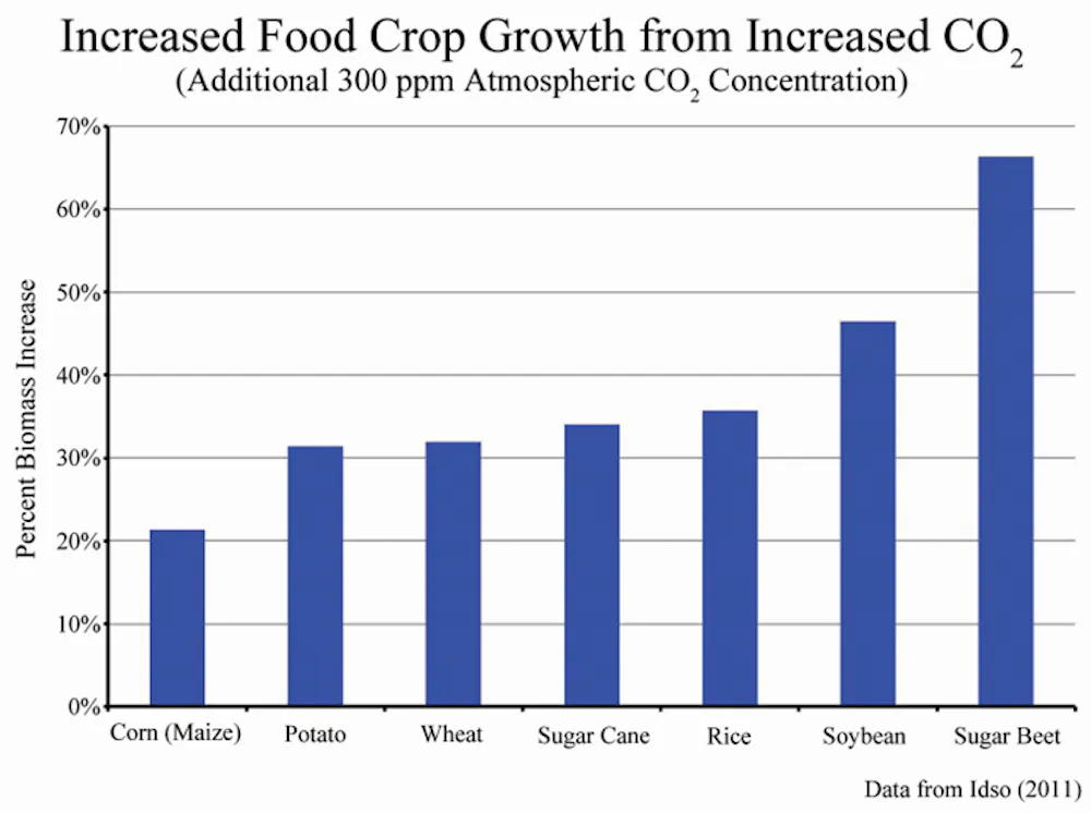 As a matter of fact, CO2 is green! Carbon dioxide is plant food. Hundreds of peer-reviewed studies show that CO2 makes plants grow bigger and faster. Plants grow larger fruits, larger vegetables, thicker stems, and bigger root systems, and they are more resistant to drought with higher levels of atmospheric carbon dioxide. Studies show that all 45 of the crops that provide 95 percent of the world’s total food production grow significantly larger with increased levels of CO2. Carbon dioxide joins water and oxygen as one of the three essential substances for life on Earth. Yet many companies and most universities now foolishly measure their “carbon footprint” and strive to reduce CO2 emissions.