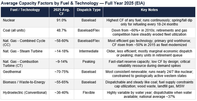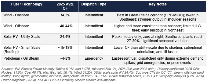 Sources: EIA Electric Power Monthly Tables 6.07A and 6.07B, released Feb. 24, 2026 (full-year 2025 data). Primary confirmed 2025 CFs: Nuclear 91.0%; Coal 48.7%; Nat. Gas (all) 58.4%; Wind 34.2%; Utility-scale solar PV 24.4%. Sub-type CFs for CC, CT, steam, offshore wind, rooftop solar, hydro, geothermal, biomass, and petroleum from EIA EPM 6.07A/B historical series, SUN DAY Campaign analysis (Feb. 2026), Power Magazine (2024), and AEO 2025 Electricity Market Module assumptions.