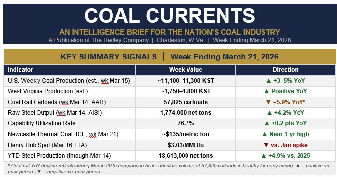 Coal Currents is a weekly intelligence brief covering U.S. and global coal markets, grid reliability, steel production, rail transportation, and energy policy. Published by The Hedley Company, Charleston, W.Va. Research and drafting for this publication was conducted with AI assistance under the direction and editorial control of the author.