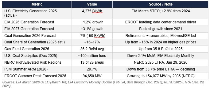 • COAL RETIREMENT DELAYS CONFIRMED — EIA March STEO flagged 4% of U.S. coal capacity for 2026 retirement but the delay pattern is well established: only 4.6 GW retired in 2025 vs. 12.3 GW planned. NERC’s January LTRA put 13 of 23 North American reliability regions at elevated or high risk. Plant owners are watching the same map grid operators are. (EIA March STEO; NERC LTRA January 2026)
