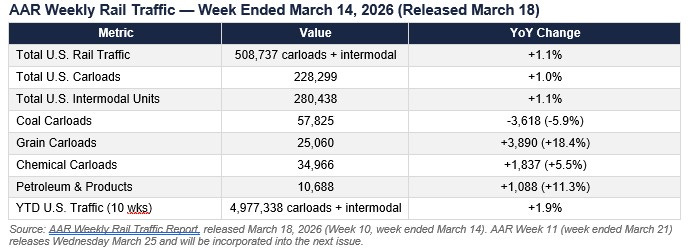 Source: AAR Weekly Rail Traffic Report, released March 18, 2026 (Week 10, week ended March 14). AAR Week 11 (week ended March 21) releases Wednesday March 25 and will be incorporated into the next issue.