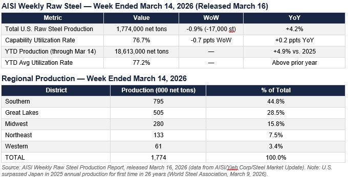 Source: AISI Weekly Raw Steel Production Report, released March 16, 2026 (data from AISI/Yieh Corp/Steel Market Update). Note: U.S. surpassed Japan in 2025 annual production for first time in 26 years (World Steel Association, March 9, 2026).