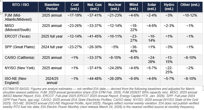 NOTE: EIA does not publish verified weekly fuel mix data by RTO. The figures below are analyst estimates derived from full-year 2025 and most-recent-available annual baselines, adjusted for known seasonal patterns (March = shoulder season: lower heating demand, lower cooling demand, wind typically elevated in Plains, solar rising). Actual weekly shares will vary with weather, dispatch economics, and outage schedules. These estimates are updated annually or when materially new RTO data is published. Verified monthly data from EIA Electric Power Monthly (EPM) is released with approximately a 60-day lag; the most recent EPM covers December 2025 (released Feb. 24, 2026).
