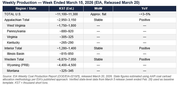 Source: EIA Weekly Coal Production Report (DOE/EIA-0218/5), released March 20, 2026. State figures estimated using AAR coal carload allocation methodology per EIA’s published approach. Verified state-level data from March 5 release (week ended Feb. 28) used as baseline template. KST = thousand short tons.