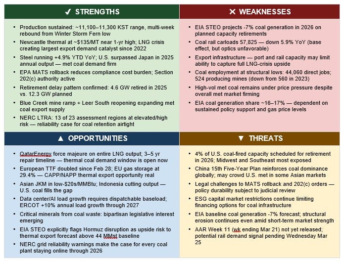 Globally, Newcastle thermal coal opened this week above $135/metric ton, near one-year highs, as European and Asian buyers scramble for non-LNG fuel. QatarEnergy declared force majeure on its entire LNG output following Iran’s missile strikes on Ras Laffan — a facility supplying roughly 20% of world LNG. European TTF gas prices have doubled since February 28. The EIA March STEO acknowledged explicitly that sustained Hormuz disruption could push U.S. thermal coal exports above the baseline 44 MMst forecast for 2026. That upside is no longer speculative.