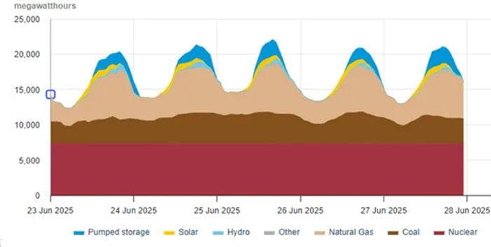 The predominant energy source over the entire period was nuclear. Coal generation was relatively consistent over the period, with natural gas generation responding to fluctuating demand and solar and pumped storage availability.