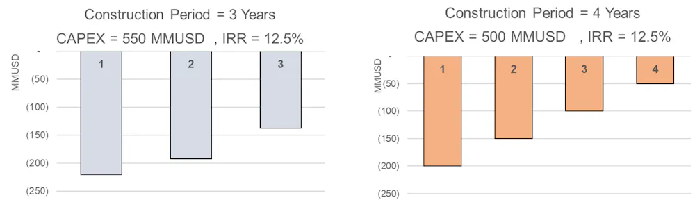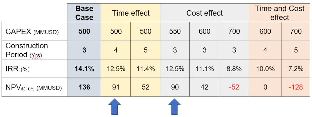 The results show that if a project is completed within the planned time and the estimated capital cost, the desired economic results will be achieved. If the project is completed at 10% more expensive but in the planned construction time, its economic result (i.e., IRR) is equal to the conditions when the project is constructed with the estimated capital cost but in one year longer (i.e., constructed in four years).
