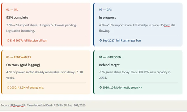 Since 2022, the EU has been running four energy transitions simultaneously: phasing out Russian oil, gas and coal, scaling renewables, and building hydrogen infrastructure from near-zero. Here is where each one actually stands.