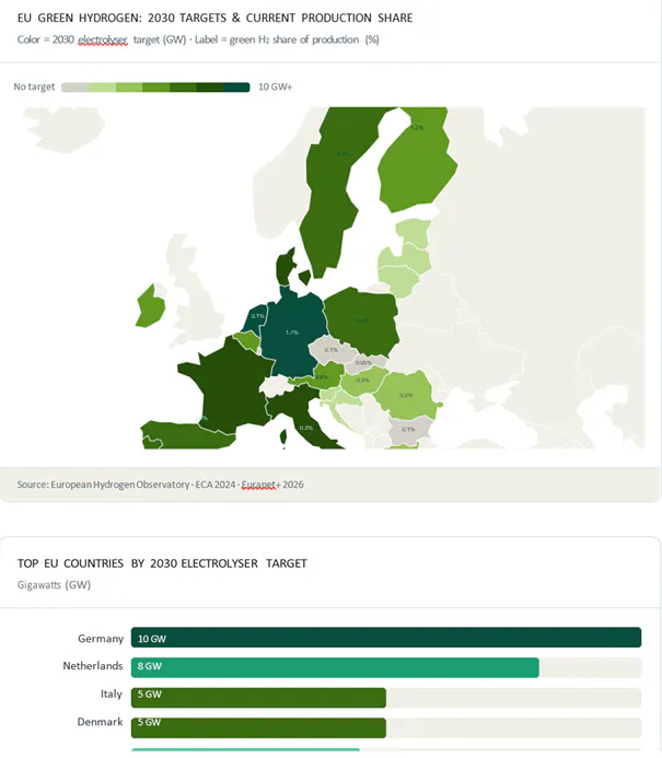 REPowerEU set a target of producing 10 million tonnes of green hydrogen domestically and importing another 10 million tonnes by 2030. Green hydrogen still accounts for less than 5% of EU production capacity. Only 308 MW of new electrolyser capacity was installed across the entire EU in 2024. Germany — the bloc's most ambitious member state — had just 0.19 million tonnes of green hydrogen production capacity last year.