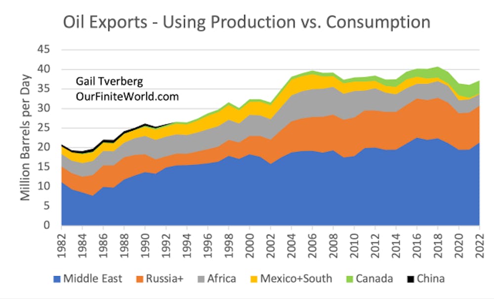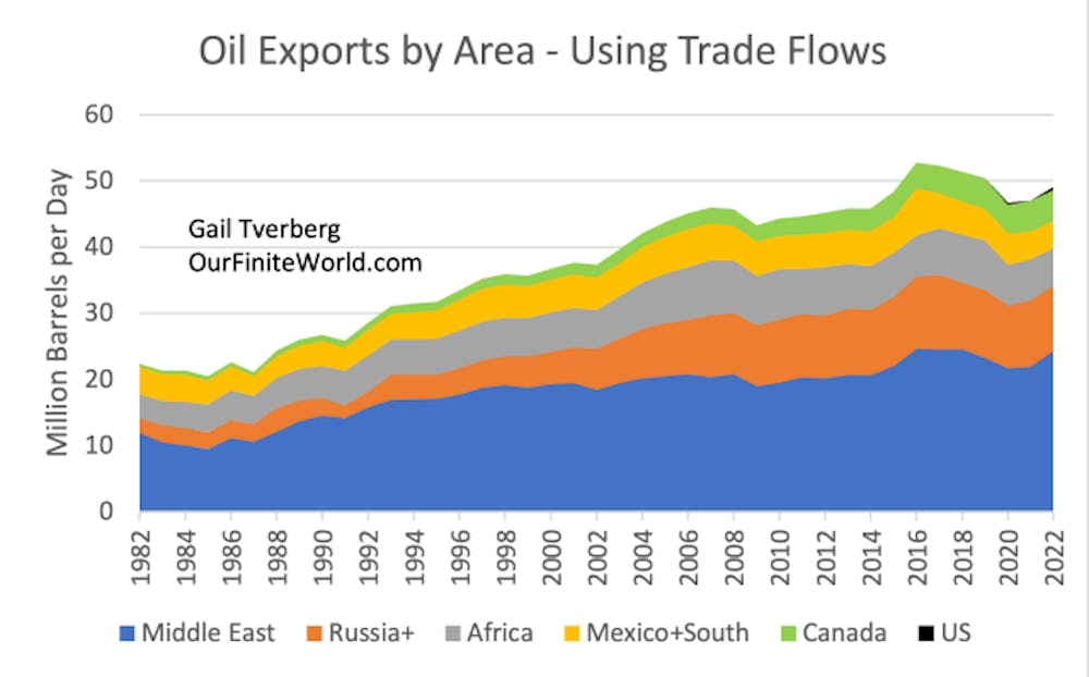 In this analysis, I have “netted out” imports and exports. On this basis, the US hasn’t moved into significant oil exporter status yet. I am sure that there are some people hoping that the oil production of the US will continue to increase, but whether this will happen is unclear. The growth of US oil production in recent years has helped offset (and thus hide from view) the falling exports of many countries around the world.