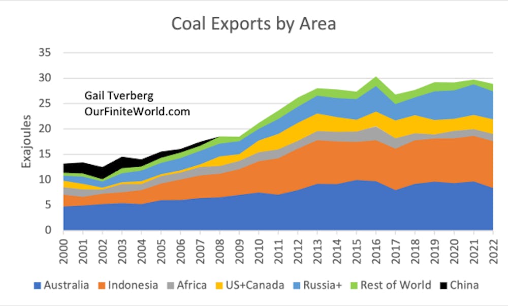 The coal exports of South Africa have declined significantly since 2018, and other African countries are eager for their imports. Today’s largest source of coal exports is Indonesia. Coal exports from Russia+, at least until 2021, have been been a source of coal export growth.