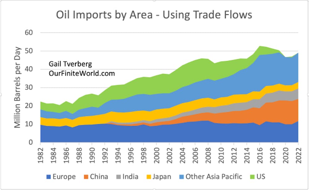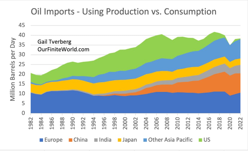 In both charts, imports for China, India, and Other Asia Pacific are clearly much higher in recent years, while imports for the US, Japan, and Europe are down. The peak year for imports (in total) was about 2016 or 2017. Imports were about 3.5 million barrels a day lower in 2022, compared to peak, with both approaches.