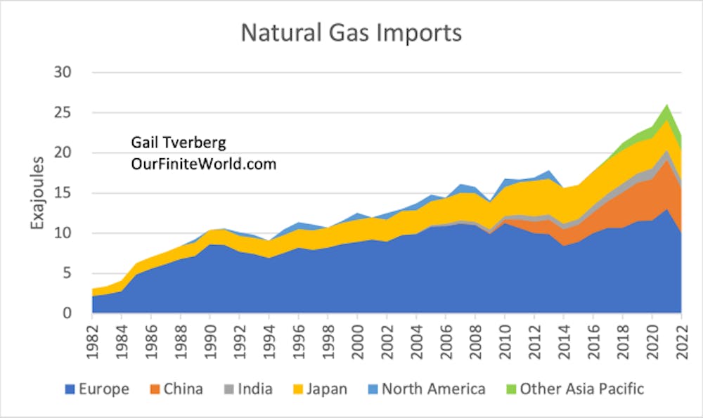 Europe was able to maintain a fairly stable level of natural gas imports between 1990 and 2018, and even to increase them by 2021. China was able to ramp up its natural gas imports. Even Japan was able to ramp up its natural gas imports until about 2014. It has tapered them back since then. India and Other Asia Pacific both have been able to add a small layer of imports, too.