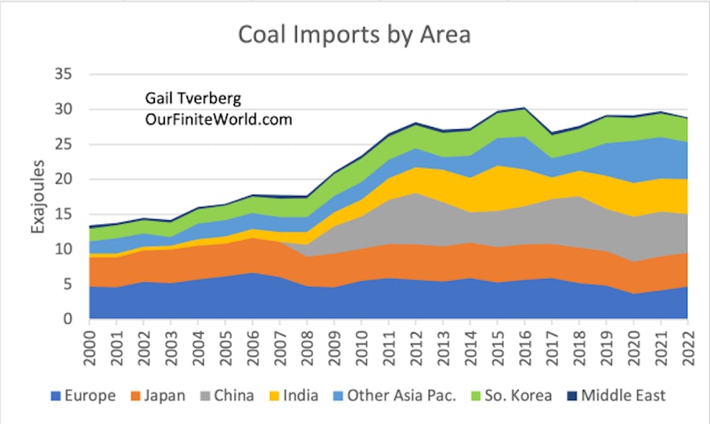 The peak in coal imports seems to have occurred about 2016. In particular, Europe’s imports of coal have fallen significantly since 2006. At the same time, coal imports have risen for many Asian countries, including China, India, South Korea, and Other Asia Pacific. Even Japan seems to have been able to obtain a fairly consistent level of coal imports for the 22-year period shown on Figure 9.