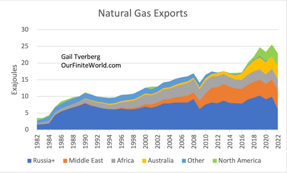 Figure 11 shows that natural gas exports from Russia+ (really Russia, with a little extra production from other countries in the Commonwealth of Independent States) have stayed fairly level, except for a big drop-off in 2009 (probably recession related) and in 2022.