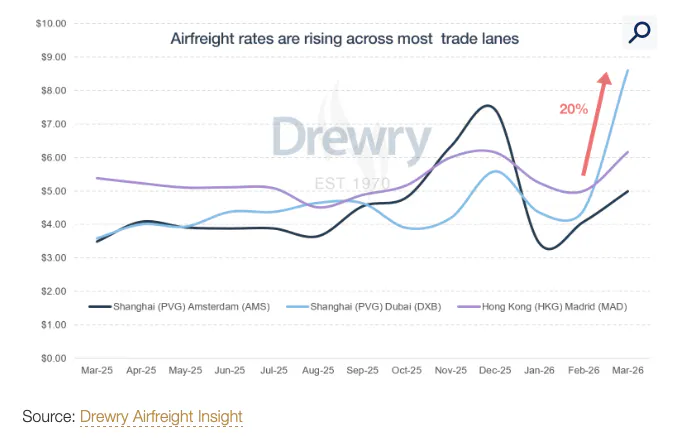 According to Drewry Airfreight Insight, month-over-month (MoM) air freight rates on roughly half of the international air freight routes it monitors jumped 20% or more in March. MoM rates on Asia-to-Middle East routes spiked as much as 95%.