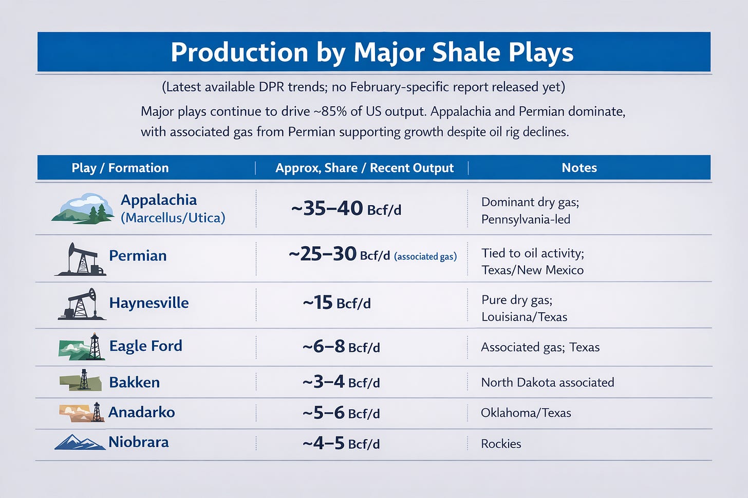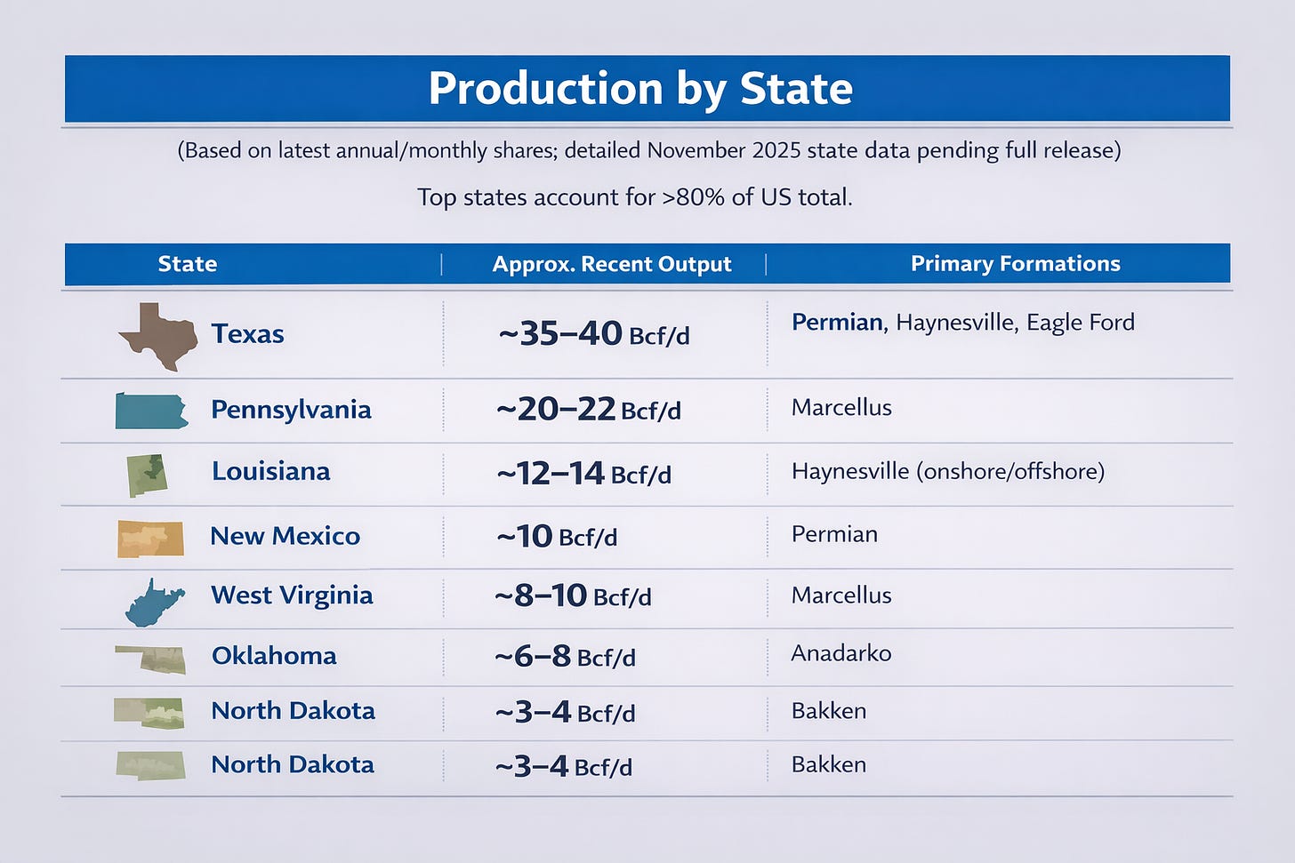 • US Gross Withdrawals: ~130.6 Bcf/d (recent monthly estimate)