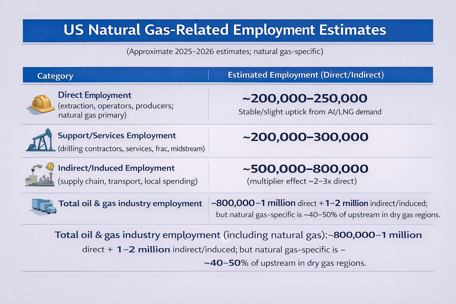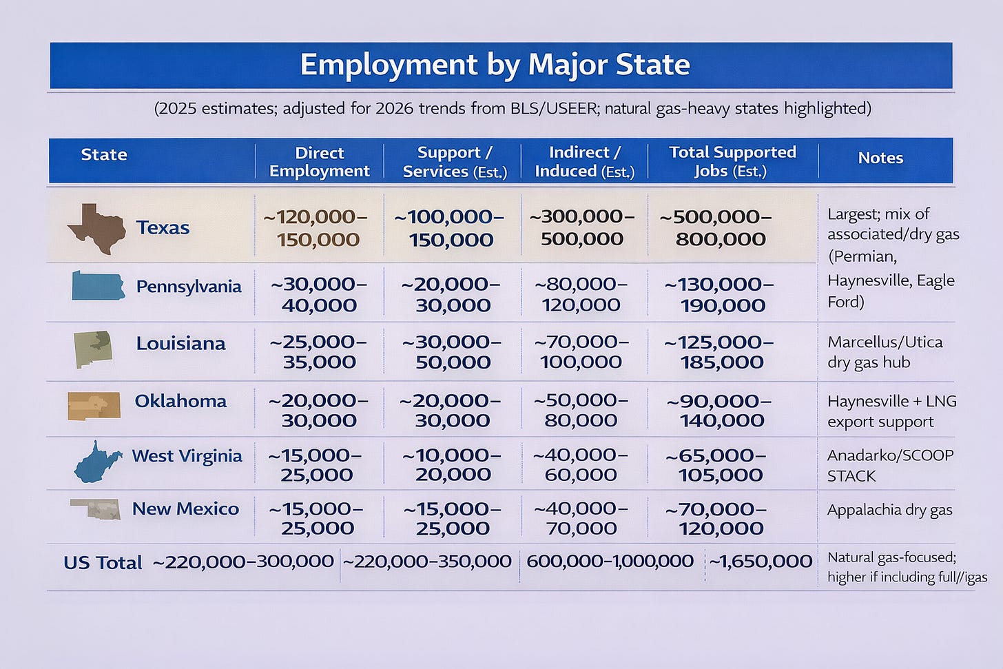 Employment data is typically annual or quarterly (latest comprehensive from 2025 USEER report and BLS trends through late 2025/early 2026). The natural gas sector (extraction, support, midstream) supports ~1–1.5 million direct jobs nationally, with broader oil & gas (including associated gas) at higher levels. Estimates blend natural gas-focused roles (e.g., dry gas plays like Marcellus/Haynesville) with total upstream/support.