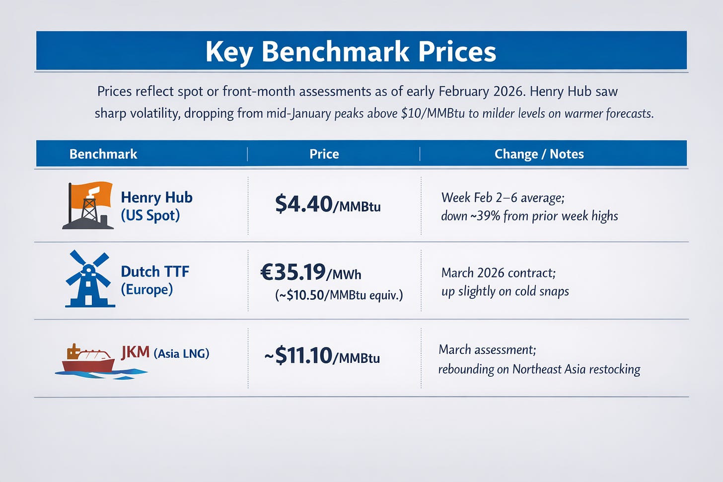 Price Rollercoaster: Henry Hub spot prices hit extraordinary highs during the storm (peaking around $28–$30/MMBtu per various reports) before collapsing sharply on milder February forecasts. The March 2026 futures contract settled around $3.40–$3.50/MMBtu by week’s end, down significantly from intra-storm surges and reflecting trader focus on upcoming warmer weather and ample remaining supplies. This volatility—described as the sharpest single-day drop in nearly 30 years—muted the bullish impact of the record draw, with speculative positioning remaining cautious.