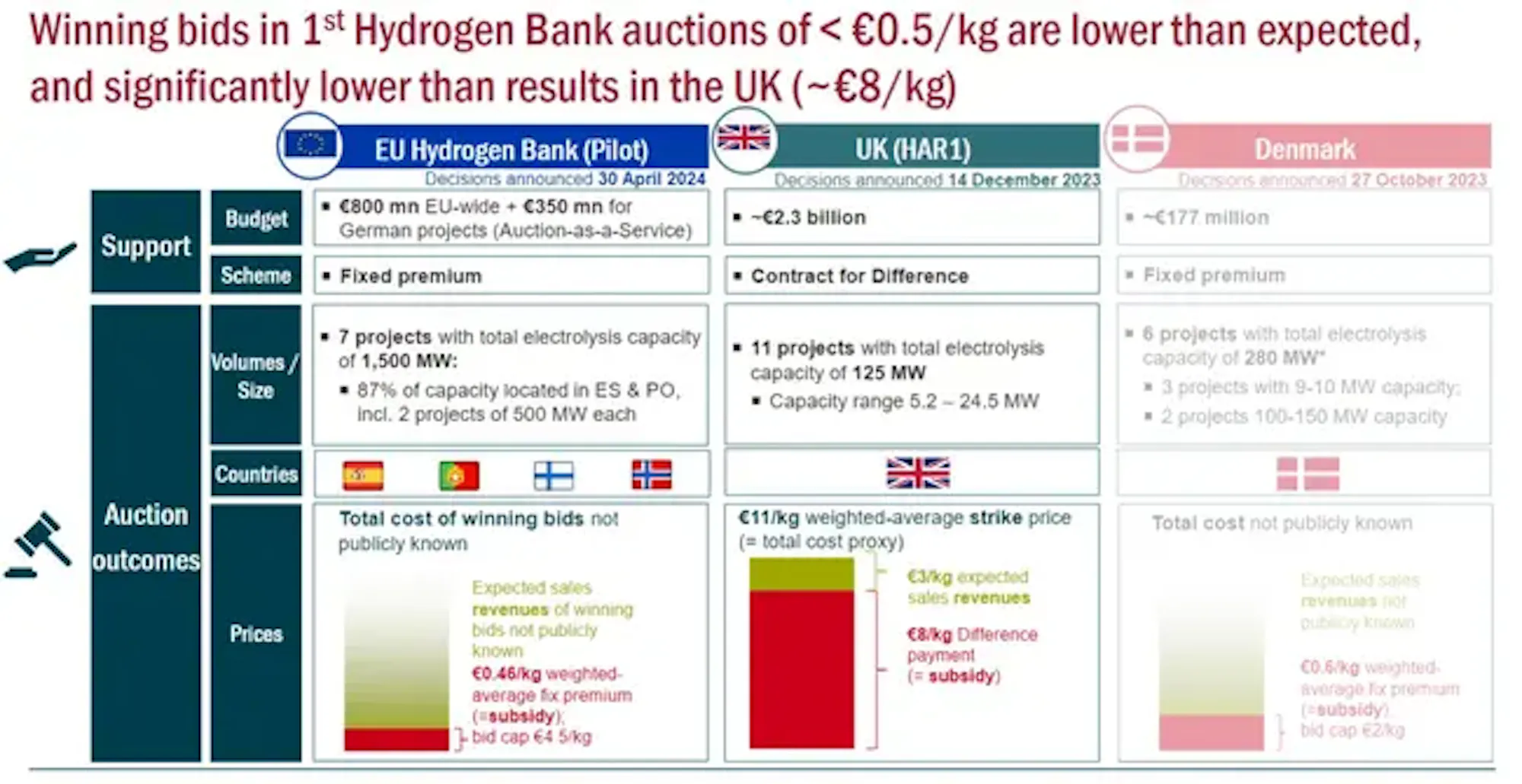 Bids unexpectedly low (€0.5/kg), particularly compared to the results of the UK hydrogen auction (HAR1) in December 2023 (~€8/kg).