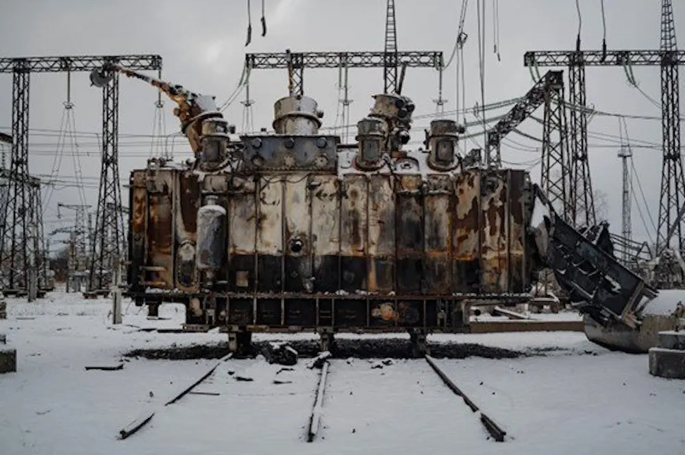The remains of a Russian long-range missile at a power plant in western Ukraine. The first strikes at the substation damaged a number of transformers. Repair crews managed to receive spare parts from across Ukraine, and spent weeks trying to bring whatever they could back online. The hope was that the station could function with limited capacity. But then, on New Year’s Eve, the station was hit again, this time by a number of Iranian-made kamikaze drones. The repaired transformers were destroyed completely.