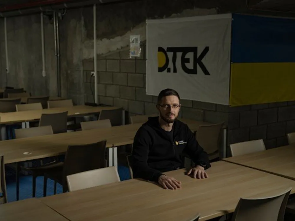 Dmytro Sakharuk, the executive director of DTEK, photographed at a former underground parking area that has been repurposed as a shelter where corporate workers descend every time there is an air-raid alarm. A damaged high-voltage transformer at a substation in western Ukraine. After successive waves of Russian strikes, Ukraine has faced a stark electricity deficit and rolling blackouts. At any given moment, millions of Ukrainian households are without power, as part of a centrally managed schedule that splits each day into three color-coded periods: green (guaranteed electricity), orange (no electricity), and white (cuts are possible). The guttural purr of diesel generators has become the background noise to life in just about every major Ukrainian city, as shops and restaurants have struggled to keep their lights on.