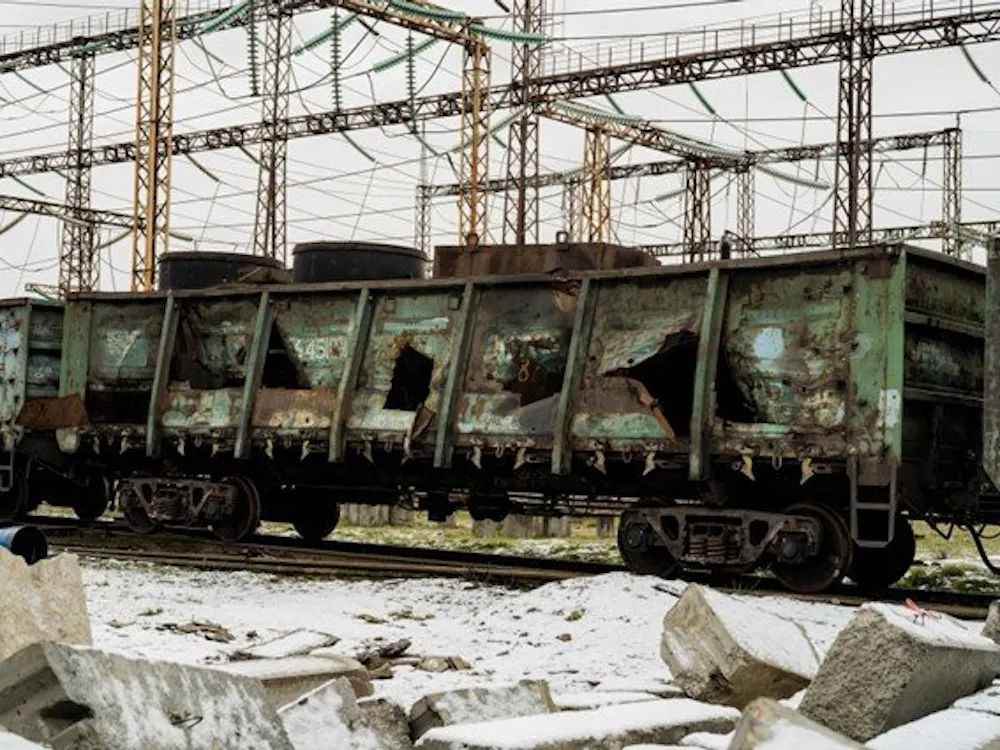 Damaged freight cars at a power plant in western Ukraine.