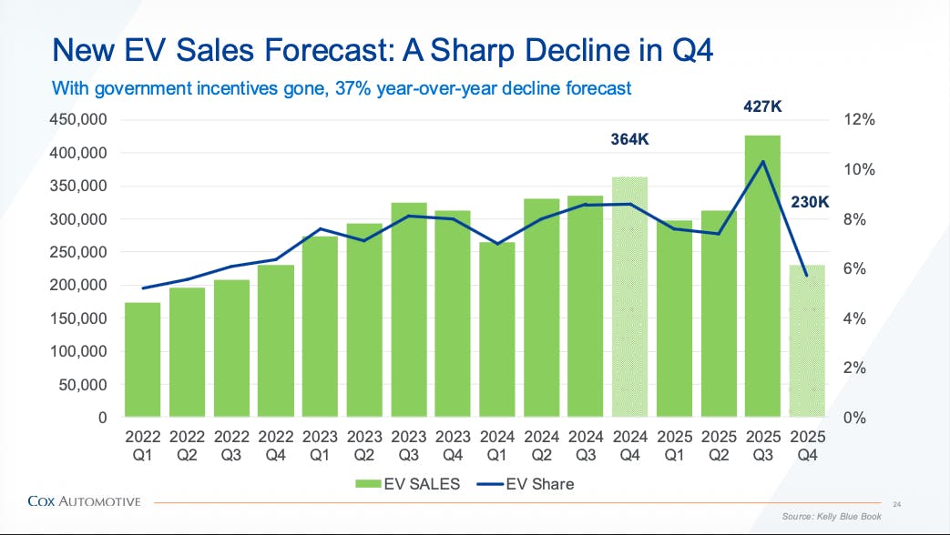 According to Valdez Streaty, sales fell 46% compared with Q3 and 37% year over year. That left EVs with a 5.7% Q4 market share.