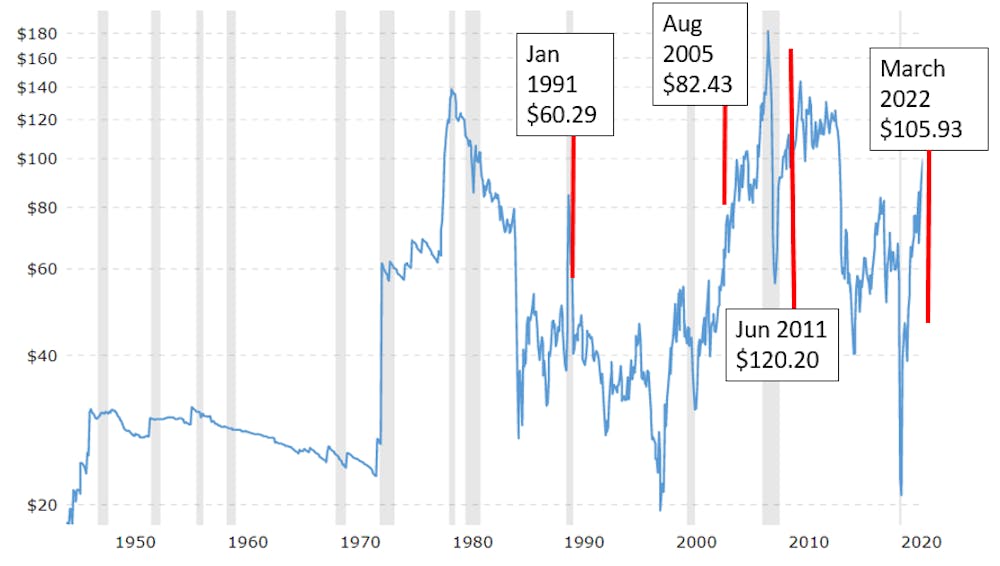 Graph 3 shows the price history of West Texas Intermediate (WTI) crude oil from 1946 to present and is adjusted for inflation. The current price of WTI crude oil as of March 31, 2022 was $100.28 per barrel.