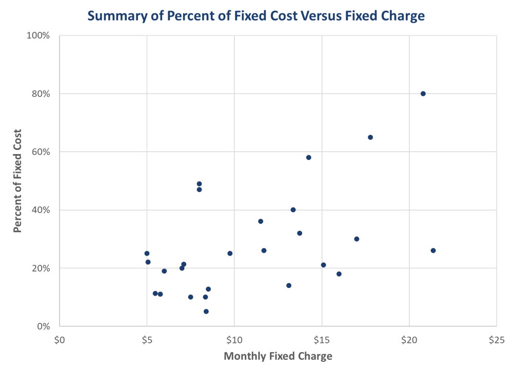 As a practical matter, the fixed charge does not even fully recover the elements identified above. Most utilities in the US would be happy if they were granted a fixed monthly charge of $25 a month, which is their estimate of the fixed network cost. A few approach that number, as show in the charts that follow. Most don’t. That’s the national picture.