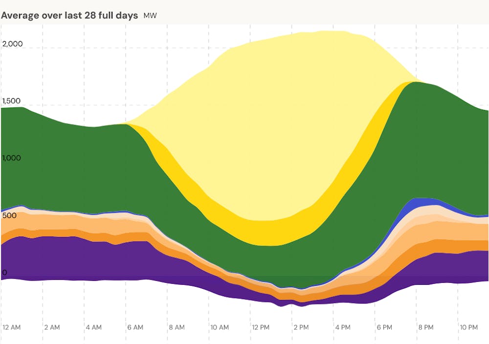 Over the past 28 days, South Australia (SA) has averaged peak generation from solar & wind of 105% of demand (130% on the best day). On each day over the past month, solar + wind generated between 48% and 102% of total daily electricity demand, with an average of 79% These numbers are rapidly increasing. SA is connected to the eastern states by a skinny interconnector that will soon be augmented, allowing much larger exports of solar & wind. SA has a very stable grid with no coal, hydro or nuclear generation. Average wholesale electricity spot price in January is about US$50/MWh. The OpenElectricity figure shows midnight-to-mignight generation averaged over 28 days: solar rooftop & farms (light & dark yellow), wind (green), gas (orange), blue (batteries) and imports (purple).