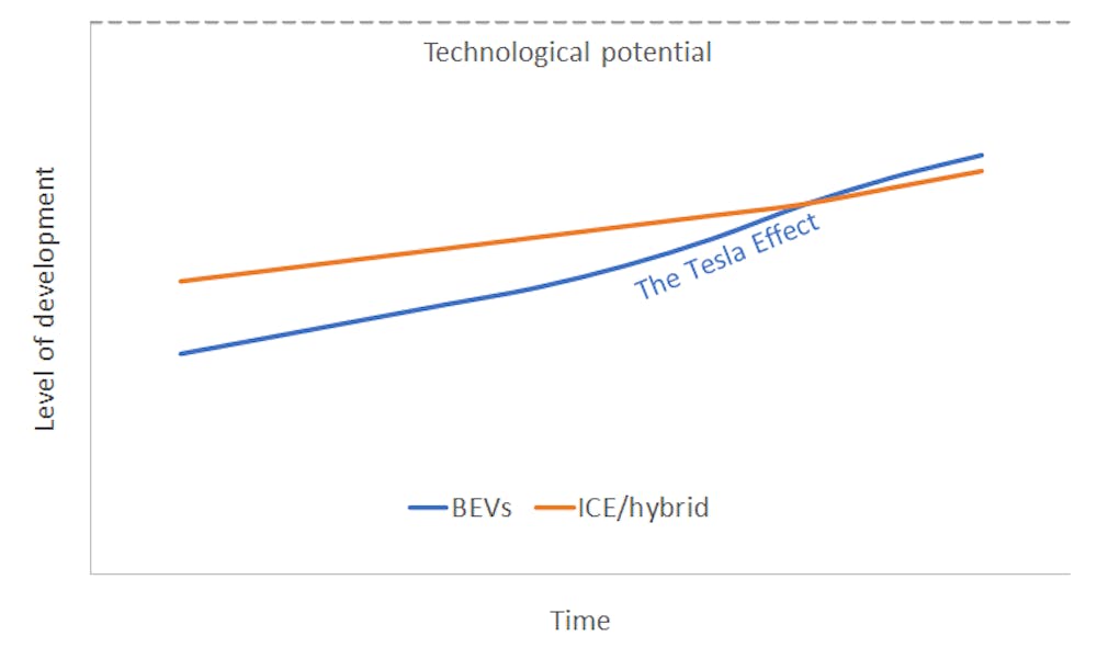 As a result, Tesla greatly accelerated the development of BEVs in terms of performance, efficiency, battery cost reduction, and charging technology. Meanwhile, traditional automakers were advancing conventional internal combustion engine (ICE) and hybrid technology at the usual incremental rate.