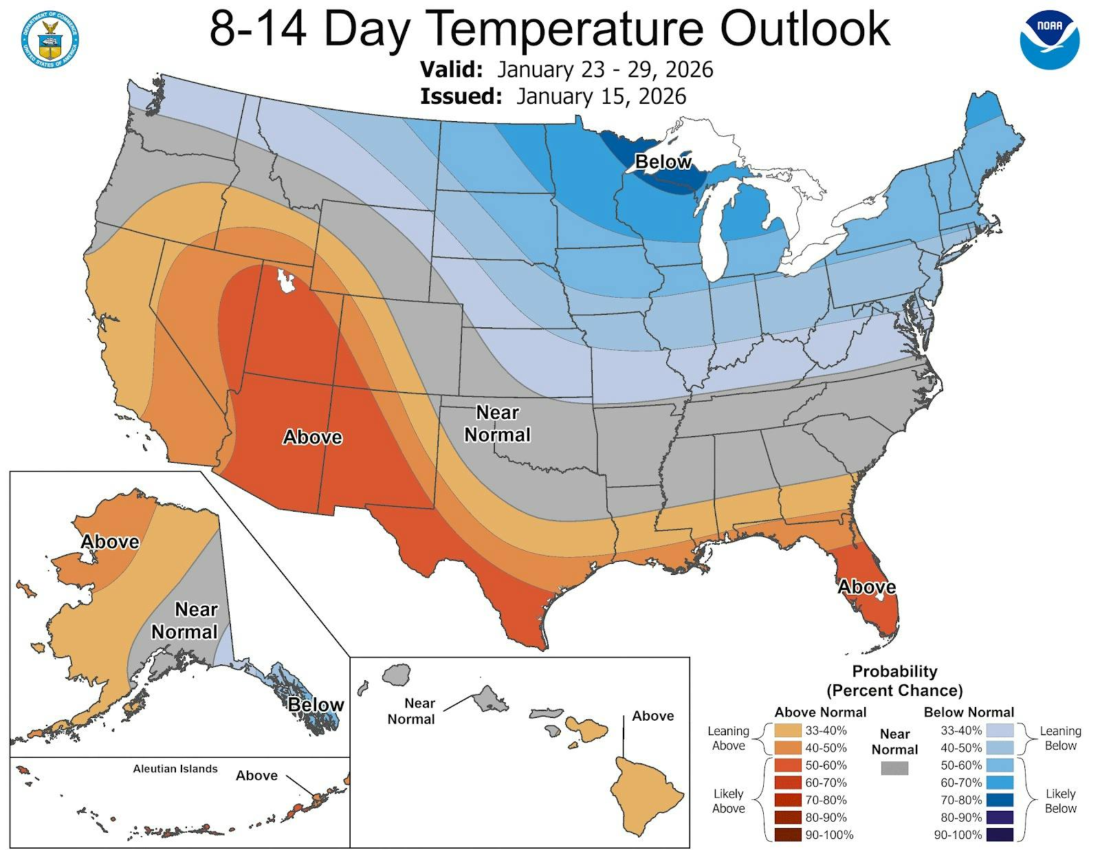 During the period of January 23–29, 2026, the United States is forecast to experience a pronounced regional split in temperature conditions. Below-normal temperatures are expected to dominate the northern and eastern portions of the country, including the Upper Midwest, Great Lakes, and Northeast, where persistent intrusions of Arctic air support anomalies of roughly 3–6°C below seasonal norms. These colder conditions are likely to reinforce wintry weather across key population centers in the Northeast and Great Lakes toward the latter part of the period. In contrast, much of the central U.S., including the Plains and Mid-Mississippi Valley, is projected to remain near seasonal averages, reflecting a transitional zone between colder air to the north and warmer regimes to the south and west.