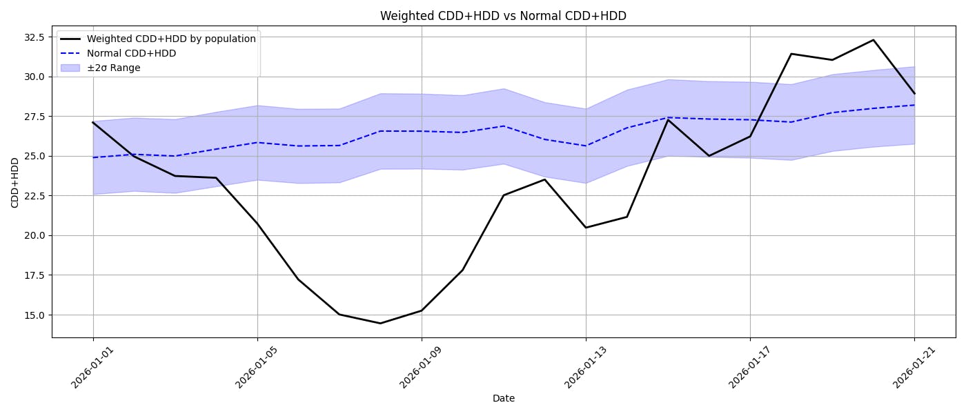 Relative to climatological norms, actual population-weighted CDD+HDD tracked mostly below the normal baseline during the first half of the week before rising toward, and briefly above, the seasonal average later in the period. Values initially hovered in the lower portion of the expected range and approached the lower edge of the ±2σ envelope before rebounding as colder weather intensified. This evolution highlights a transition from milder-than-normal conditions toward a more seasonally typical winter demand profile, without sustained excursions beyond the normal range.
