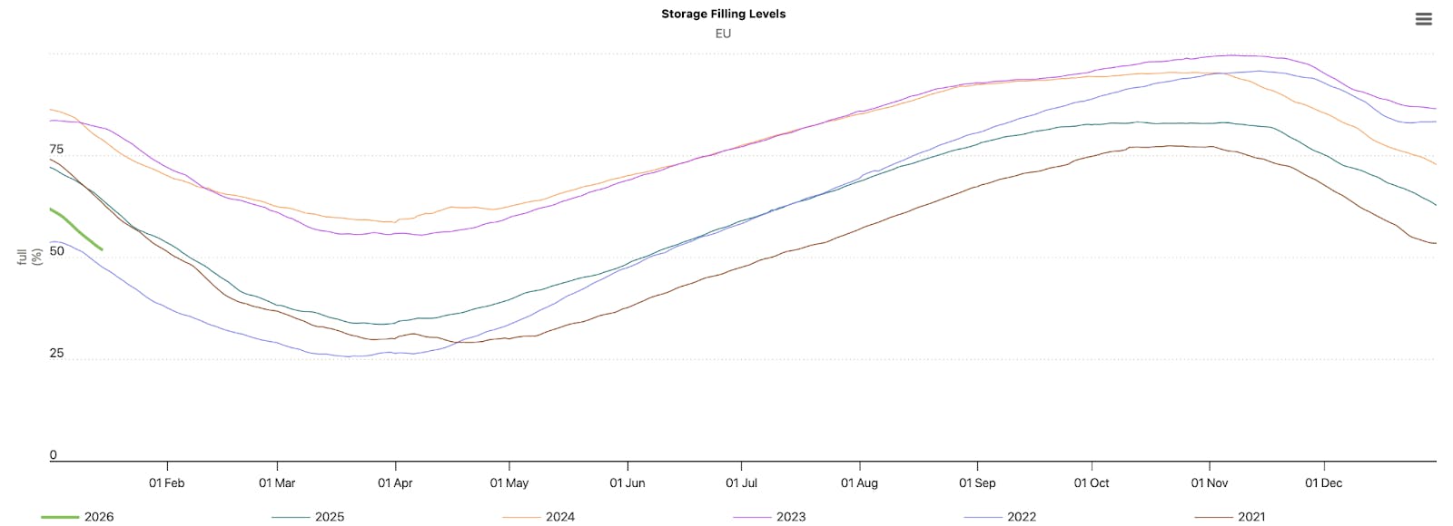 As of mid-January 2026, average European underground gas storage levels stand at roughly 57–58% full, based on the latest EU-wide trend data. This represents a marked decline from the same period last year, when inventories were close to 69%, and sits well below the exceptionally strong positions recorded in 2023 and 2024, when storage exceeded 80% at the turn of the year. Relative to the past five years, current levels fall into the lower half of the historical range and are closer to the weaker benchmark observed in 2022, reflecting heavier withdrawals during the early part of the heating season. The refill cycle through summer 2025 progressed steadily but peaked earlier and at a lower level than in the prior two years, leaving a reduced buffer entering mid-winter. Overall, Europe enters the core of the heating season with adequate but noticeably thinner storage coverage compared with recent winters, reducing flexibility in the event of prolonged cold spells.