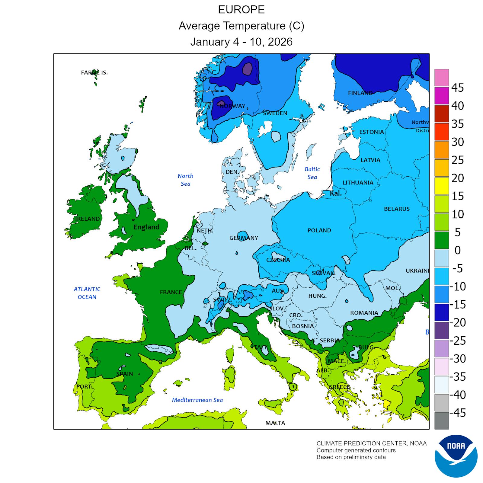 Across Europe, average temperature conditions during the period of January 4–10, 2026 reflected a pronounced cooling across northern and eastern regions. Scandinavia, including Norway, Sweden, and Finland, along with the Baltic states, Belarus, and large parts of Ukraine, experienced persistently low average temperatures, consistent with a strong Arctic influence extending deep into the continent. Central and Eastern Europe, including Poland, Czechia, Slovakia, and parts of the Balkans, also trended notably cooler than seasonal norms, reinforcing a broad cold regime across the northern and eastern tier.