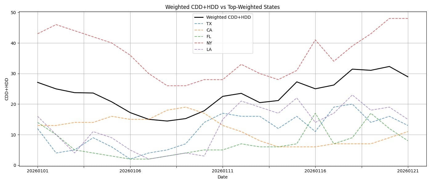 During the week of January 15–21, 2026, population-weighted combined cooling and heating degree days (CDD+HDD) across major U.S. demand centers increased overall, signaling a strengthening winter demand profile. The national weighted index rose through the second half of the observed period, following a brief dip early in the week, as colder conditions expanded across large population hubs. This pattern reflects a shift away from earlier moderation toward a more heating-driven regime, consistent with mid-winter conditions taking hold across much of the country.