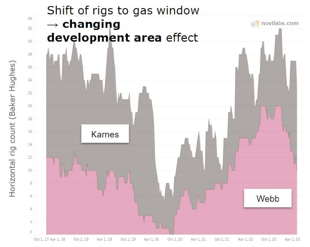 In the Eagle Ford, GOR has risen “only” 50% over 10 years, but much of that increase has been since 2020. Here, the driving factor has been “changing development focus areas”, with operators drilling more in the gassier parts of the play like Webb County. It’s a logical response to higher gas prices in one of the few plays to offer the full spectrum of fluid windows.