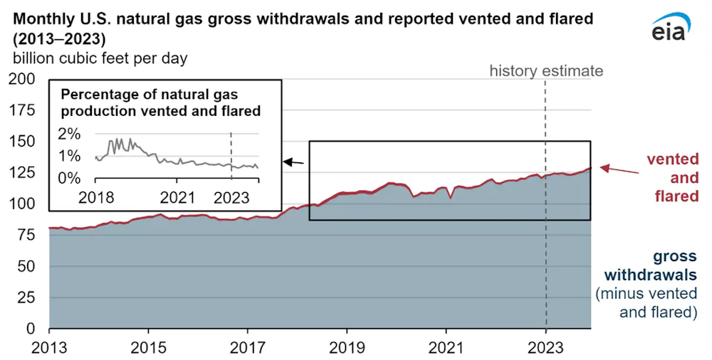 Last year, American companies flared and vented the lowest volume of natural gas in almost two decades. The U.S. Energy Information Administration preliminary estimate for 2023 reports volumes of vented or flared gas declined to .5 percent of gross withdrawals, demonstrating how industry best practices have worked to keep natural gas in the pipes and not going up the stack.