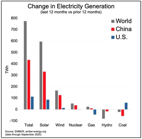 Here is my favorite quote: Electricity "is measurable, divisible, storable, and universal—all qualities that a currency needs, but unlike fiat and crypto, it’s actually directly linked to productive output. No politics. No inflation. Just physics." China is building the “mint” for this new currency at an incredible, world-changing scale, and it has retained absolute state control over its distribution. Total new electricity generation, predominantly from renewables, is staggering, says Lambert. "The country met its 2030 target of 1,200 gigawatts of renewable capacity five years early, in 2025."