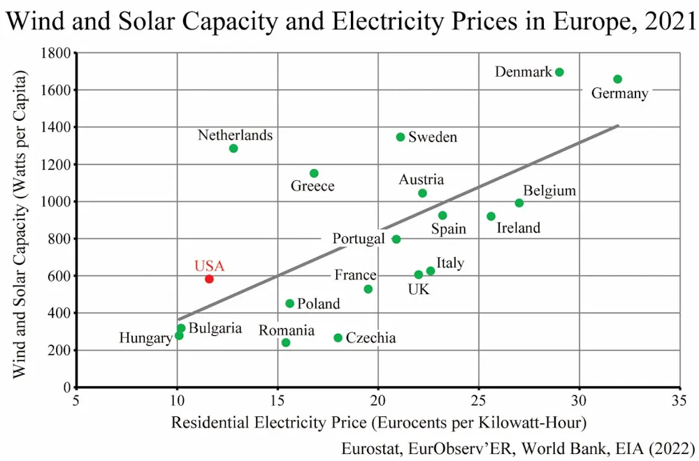 In Europe, the nations with the most wind and solar capacity deployed, including Austria, Belgium, Denmark, Germany, Ireland, Spain, and Sweden, experience the highest residential electricity prices. Residents of Bulgaria, Hungary, Poland, and Romania, where few renewables are deployed, pay half as much per kilowatt-hour as the leading renewable countries. Denmark and Germany have deployed over 1,600 watts per person of wind and solar, the highest density in Europe. Electricity prices for Denmark (29 eurocents per kilowatt-hour) and Germany (32 eurocents/kW-hr) are the highest in Europe, and two and one-half times the prices in the US, where renewable penetration remains lower. In Europe, like the US, wind (and solar) deployments raise electricity prices.