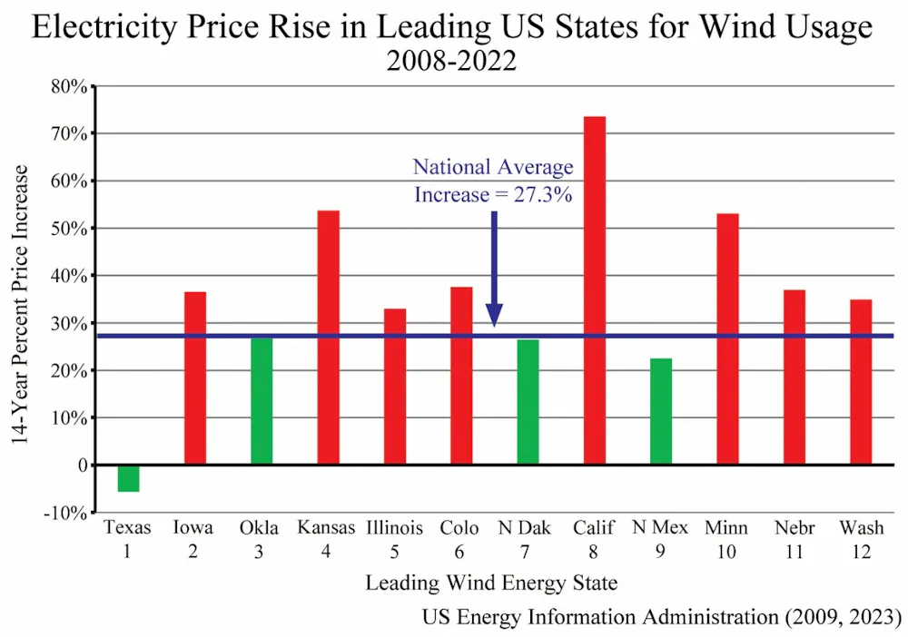 Electricity prices in states with the highest penetration of wind systems are rising faster than the national average. US average electricity prices rose 27 percent from 2008 to 2022. But in eight of the top 12 wind states, power prices rose between 33 and 73 percent over the 14-year period. Prices rose in Iowa (36%), Kansas (54%), Illinois (33%), Colorado (37%), California (73%), Minnesota (53%), Nebraska (37%), and Washington (35%), which are the number 2, 4, 5, 6, 8, 10, 11, and 12 leading states in terms of electricity generated from wind, respectively. Price increases were lower than average in Texas, Oklahoma, North Dakota, and New Mexico, the other four leading wind states. The data shows that deployments of wind systems produce higher electricity prices.