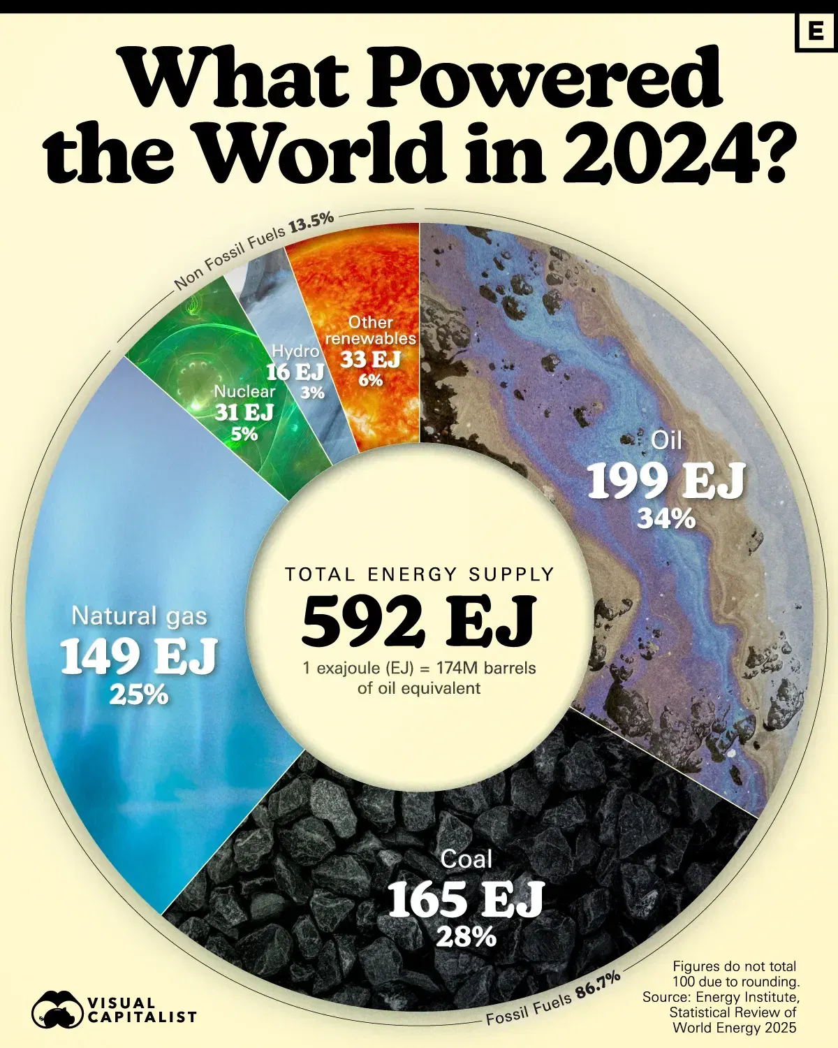 Global energy demand reached a new record, 592 EJ in 2024 – this according to a new revealing chart produced by Visual Capitalist’s Dorothy Neufeld and Sabrina Lam. Despite the continued growth in renewables, traditional energy still dominates the global energy system – accounting for roughly 87% of total consumption. The rise in electricity demand, driven most by artificial intelligence (AI) technologies and the growth in data centers, expanded at twice the pace of total energy consumption. Powering good!