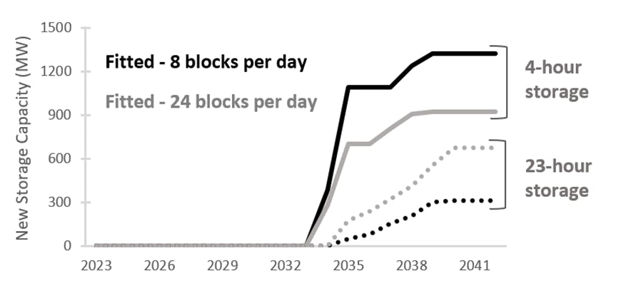 Figure 2. Comparison of storage deployment by capacity (MW) under different temporal resolutions. The darker line, “Fitted – 8 blocks per day”, represents a fitted chronology approach that divides the day into eight 4-hour blocks. The grey line, “Fitted – 24 blocks per day”, represents a fitted chronology approach that uses 24 blocks per day, corresponding to all 24 hours.