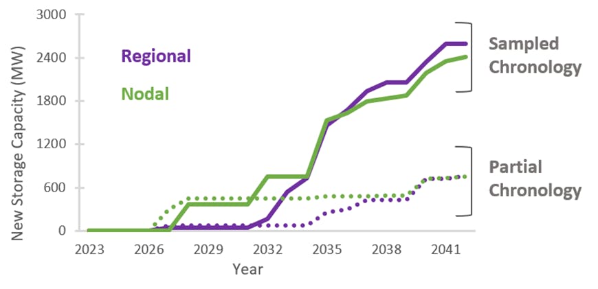Figure 1. Comparison of new storage capacity (MW) across three low-carbon resource portfolios, identified using different temporal resolution modeling strategies. Partial chronology simplifies the hourly load into a set of blocks per month based on load duration curves. Sampled chronology selects the most representative sample days, weeks, or months in the year while maintaining the chronological order of the simulation periods. Fitted chronology approximates the hourly load series with a step function using a weighted least-squares technique, and simulation periods preserve their chronology since only continuous intervals are aggregated into steps.